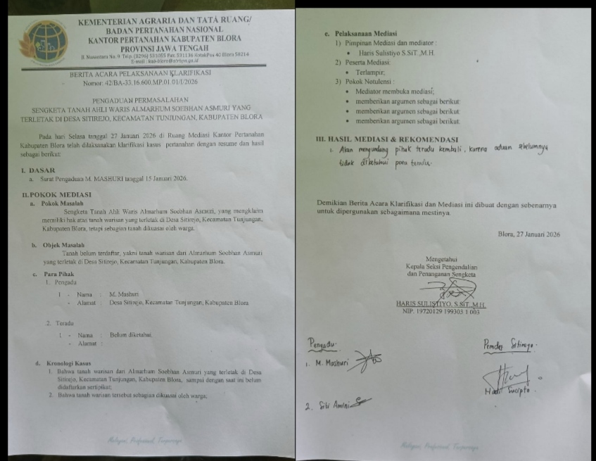 Kasubag Tata Usaha ATR/BPN Kabupaten Blora, Elvyn Bina Eka Kusuma, S.Si, membenarkan penundaan mediasi. “Kita sudah mengundang para pihak terlapor selaku ahli waris lainnya, namun tidak hadir. Maka kita simpulkan mediasi ditunda dan akan dijadwalkan ulang,” jelasnya.