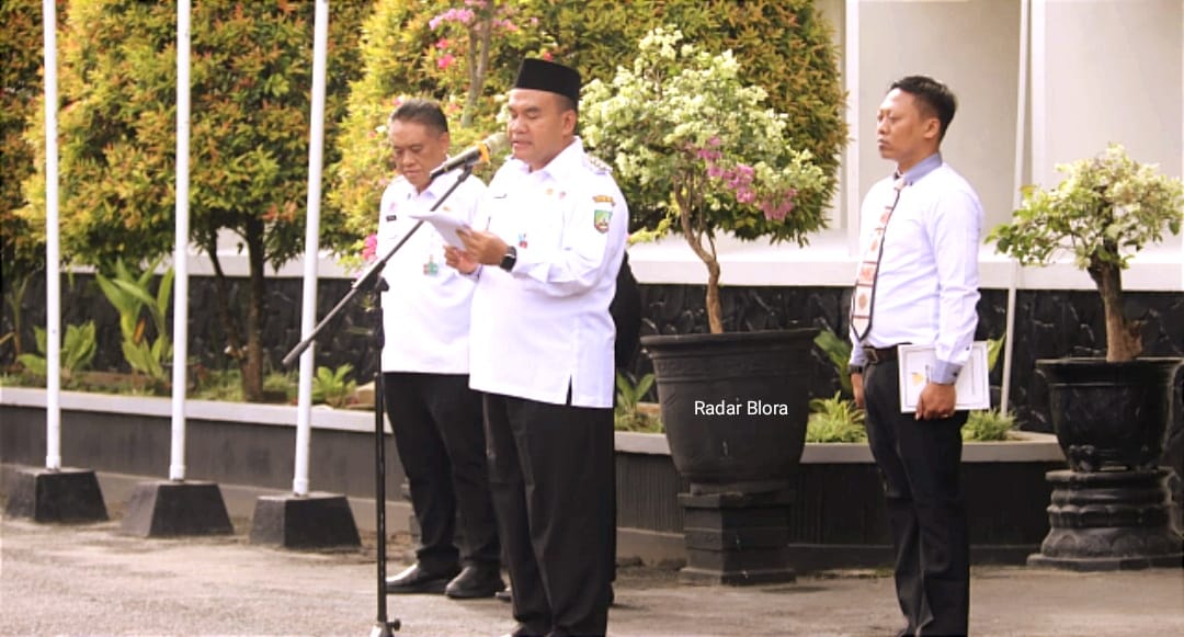 Bupati Blora, Dr. H. Arief Rohman, S.IP.,M.Si.,memimpin apel pegawai di halaman Sekda (foto dok: Humas/Radar Blora)