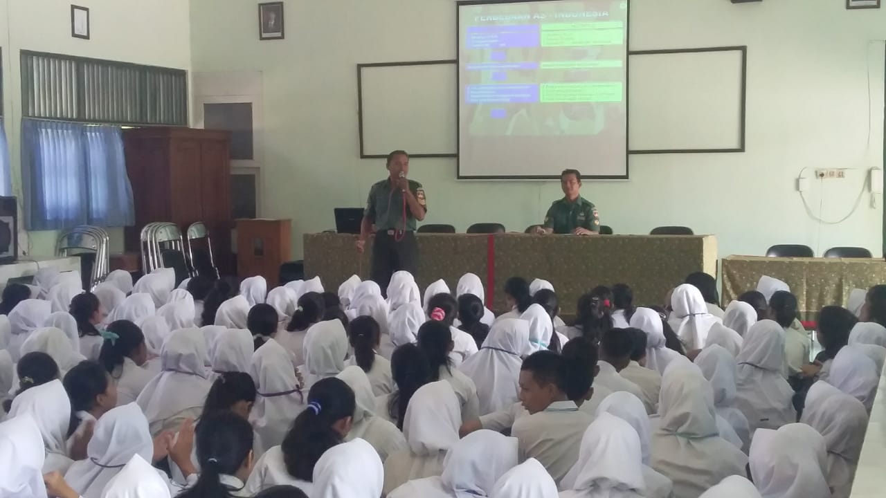 Serma Sugiharto menyampaikan materi mengupas nilai-nilai yang terkandung didalam 5 kesila tersebut karena sabagai siswa-siswi SMA Sederajad sudah harus memahami dan mengamalkan nilai pancasila tersebut agar mempunyai jiwa nasionalisme dan patriotisme yang tinggi serta sebagai generasi muda penurus bangsa yang tangguh dan profesional.(HB -01)