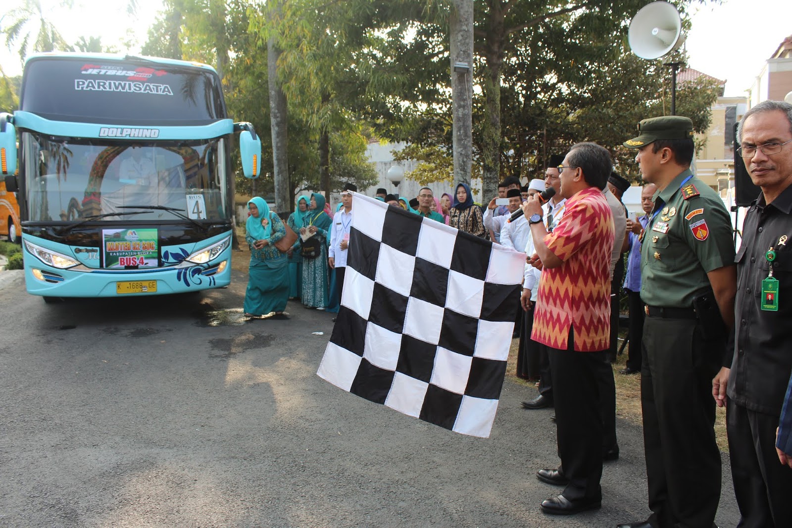 Dengan didampingi jajaran Forkopimda dan Kepala OPD terkait, selasa 31/07/2018, pelepasan dilakukan Bupati dengan pengibasan bendera diikuti kumandang lafal “Labbaikallahumma Labbaik….” yang menggema dari ribuan pengantar yang memadati Alun-alun Blora.