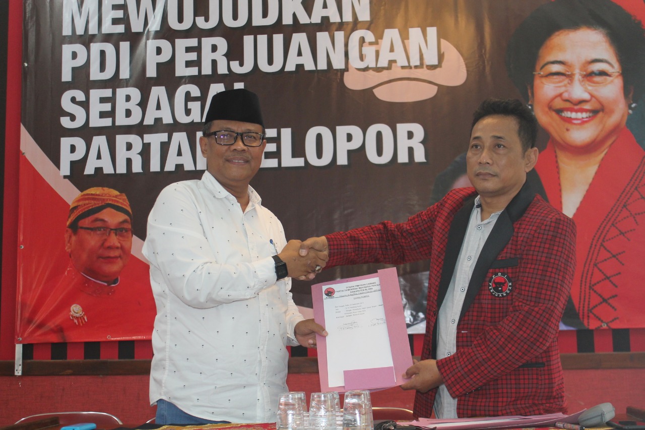 | Penyerahan tanda terima formulir dari Ketua Panitia Pendaftaran Bacabup/Bacawabup PDIP Blora,Kuat Prihantoro kepada Bambang Susilo |