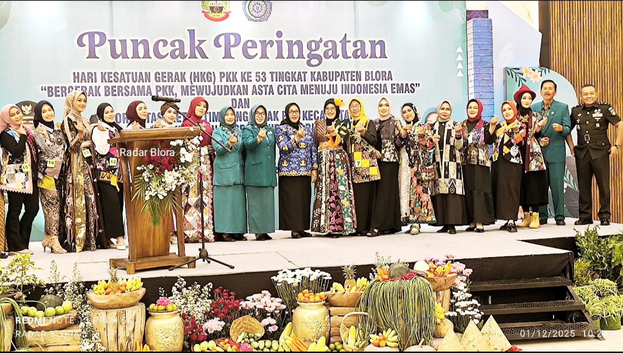 RADARBLORA.COM,– Dalam peringatan Hari Kesatuan Gerak (HKG) PKK ke-53 Tahun 2025, Ketua TP PPK Kabupaten Blora, Hj. Ainia Shalichah Arief Rohman, yang mewakili Ketua Umum TP PKK Pusat Ny. Tri Tito Karnavian, menegaskan bahwa Gerakan Pemberdayaan dan Kesejahteraan Keluarga (PKK) telah menjadi gerakan sosial paling masif di Indonesia yang mampu menjawab tantangan pembangunan nasional. PKK dinilai sebagai agen perubahan dan pilar utama dalam pembangunan berbasis keluarga.