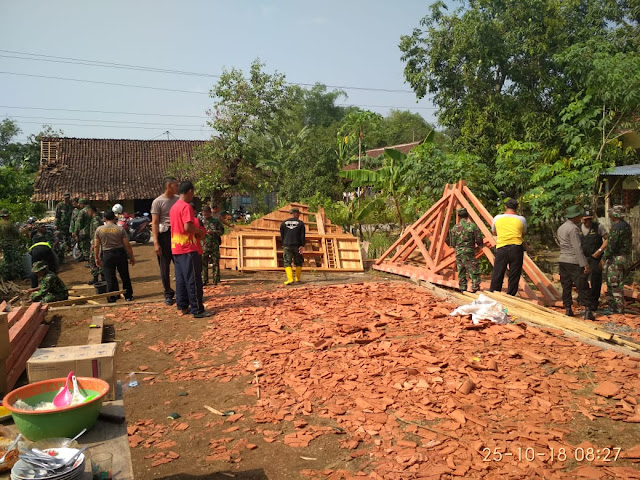 Masih terlihat sisa puing puing rumah yang roboh tertiup angin kencang semalam dan pagi ini dengan penuh semangat Warga bersama Polri dan TNI gotong royong bersama mendirikan rumah itu kembali(Red-HB01)