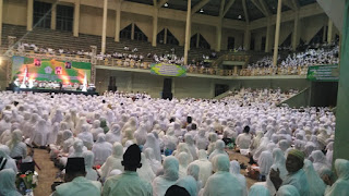 HALOBLORA.COM Jemaah pengajian akbar yang diselenggarakan oleh majelis Istighosah dan Manakiban mulai berdatangan ke Gelanggang Olahraga (GOR) Mustika, Kabupaten Blora. Ribuan Jemaah dari dalam maupun luar kota Blora seperti, Kudus, Pati, Jepara, Grobogan dan Bojonegoro (Jawa Timur), mulai berdatangan sejak pukul 17.00 WIB, Senin (10/09/18) kemarin. Para jemaah mayoritas memakai busana muslim bewarna putih.