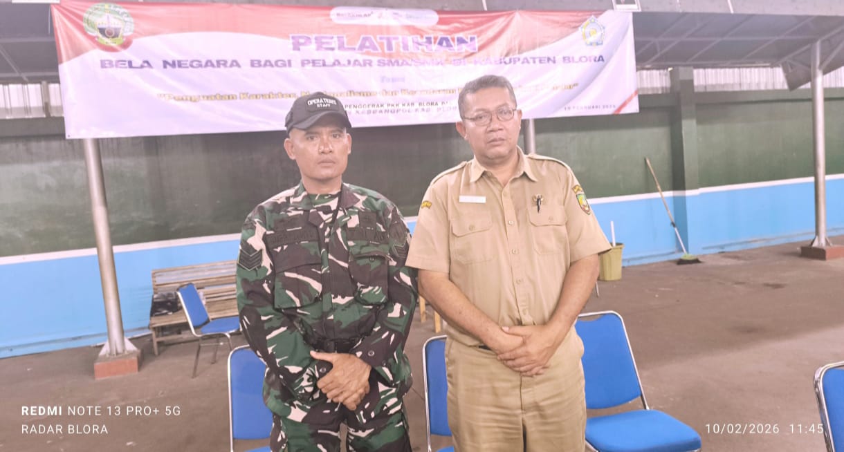 RADARBLORA.COM, Sebanyak 60 pelajar SMA/SMK se-Kabupaten Blora mengikuti Pelatihan Bela Negara yang digelar Pemkab Blora melalui Badan Kesatuan Bangsa dan Politik (Kesbangpol) bekerja sama dengan Tim Penggerak PKK Kabupaten Blora. Kegiatan yang bertempat di Indoor Gor Mustika Blora pada Selasa 10 Februari 2026 ini difokuskan pada penguatan karakter, kedisiplinan, dan rasa nasionalisme secara non-militer.